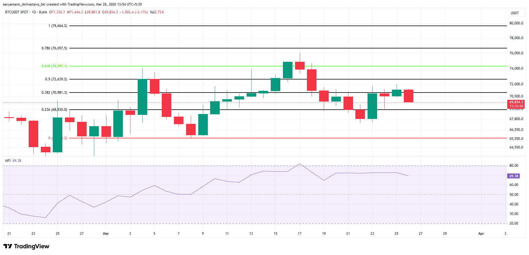 Current price at $69,834 places BTC between the 23.6% level at $68,930 and the 38.2% level at $70,981. The MFI at 69.38 remains below 80, meaning there is room for buying pressure to build before the indicator signals overbought conditions.