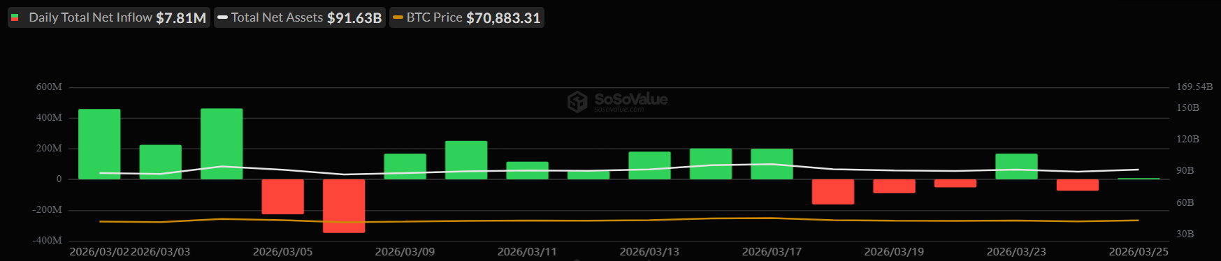 Bitcoin spot ETFs recorded a daily total net inflow of just $7.81 million on March 25, a figure that stands well below the early-March peaks visible on the SoSoValue chart. The total net assets across all Bitcoin spot ETFs stand at $91.63 billion, and the white trend line on the chart shows that figure has been gradually declining since early March.