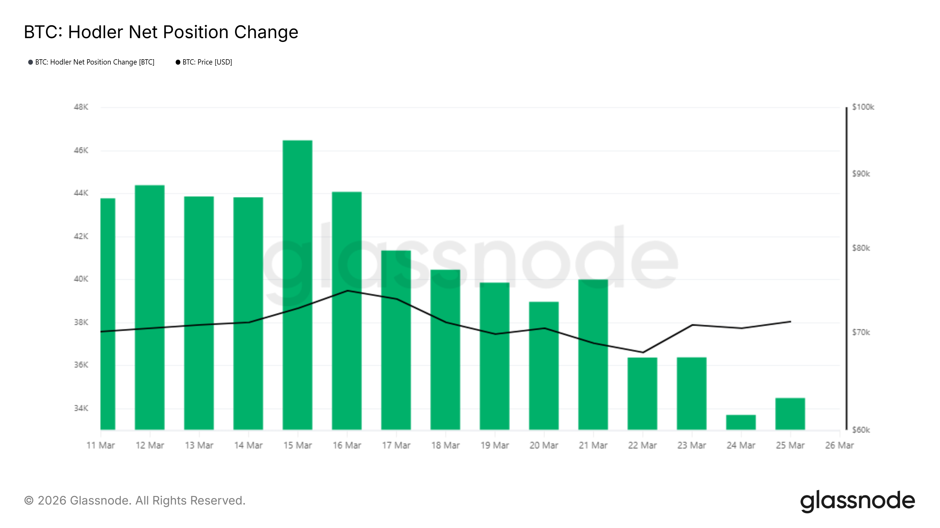 The Glassnode hodler net position change chart covers March 11 through March 25. Every bar in this period is green, meaning long-term Bitcoin holders were net accumulators throughout. However, the size of those bars tells a different story as the month progressed.