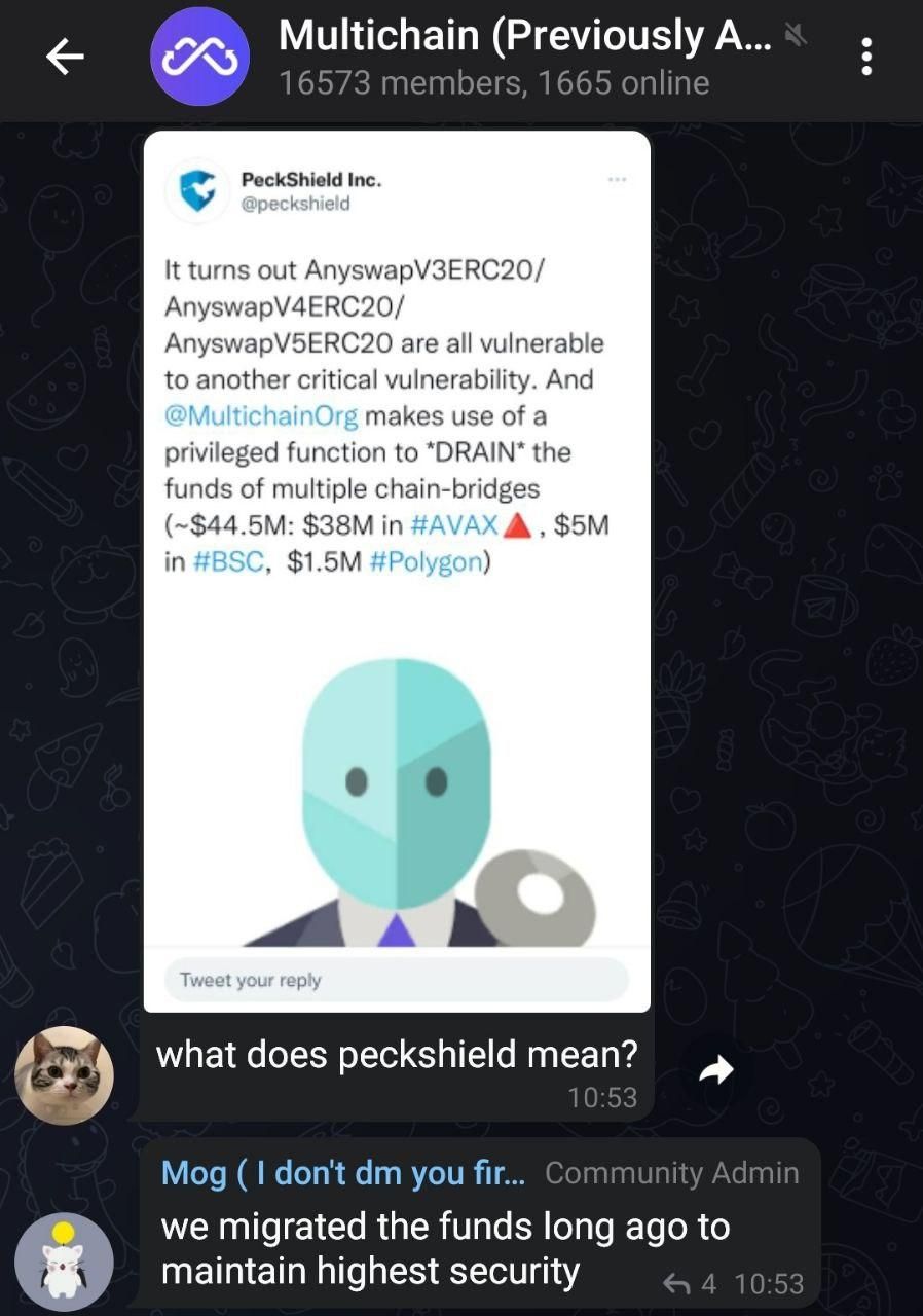 Furthermore, one of Multichainâs Telegram group admins that goes by Mog, noted that the team had âmigrated the funds long ago to maintain highest security.â But Tal Beâery who is a cyber security researcher and the chief technology officer at ZenGo, said that Multichain picked the âthe worst way to treat a vulnerability.â
