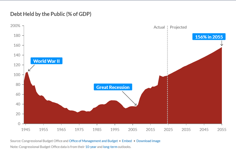 The chart shows that the US public debt is projected to reach 156% by 2055, according to the Congressional Budget Office.