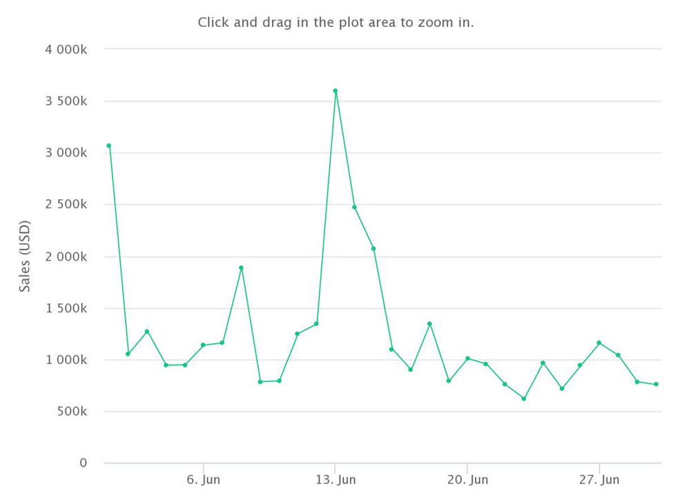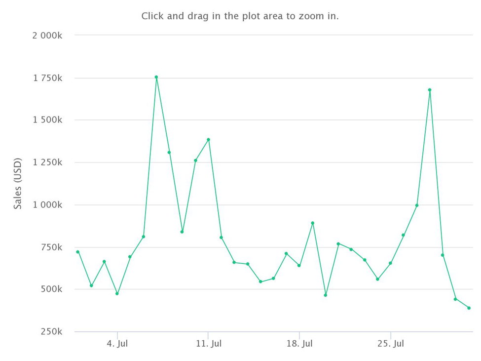 By generating less than $30 million in sales for the first time, volume fell by $236 million. In addition to unique buyers and transactions, average sale value also took a massive hit. There was a 75% plunge in average sale value from $92,874 in April to $22,326 in July. Â