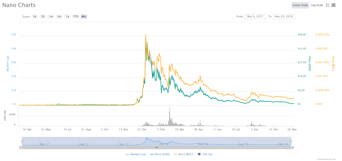 With Nano (NANO) prices currently at $1.08 with a market cap of $143 million, fluctuating wildly throughout the 2018 year, price predictions have been equally volatile. However, it is safe to say that, despite the bear market seen in the last half of 2018, as well as other market issues such as the Bitcoin Cash hard fork, the Nano platform has held its own.