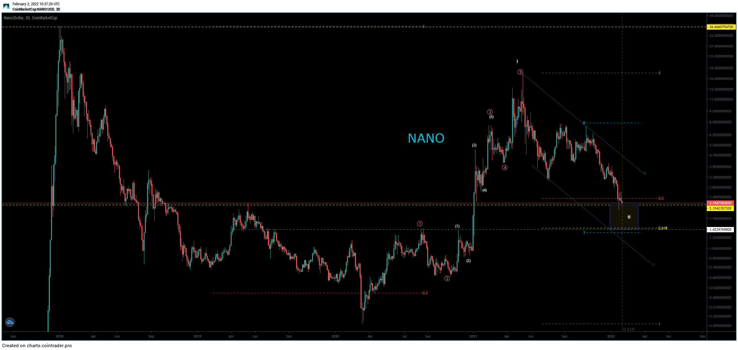 Measuring from the March 2020 low, it does seem that NANO has completed a five wave upward movement (white), which led to the all-time high price.Â