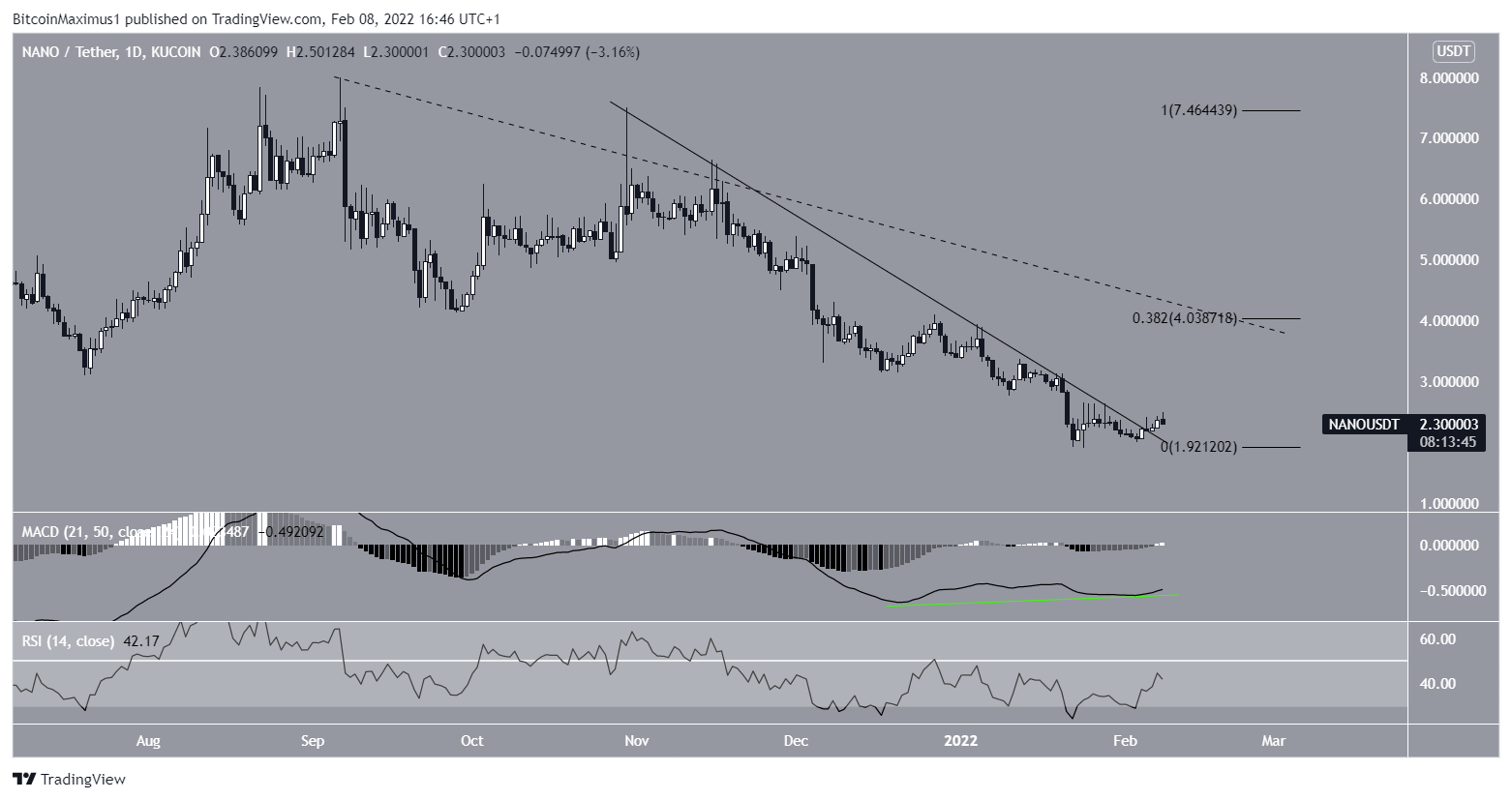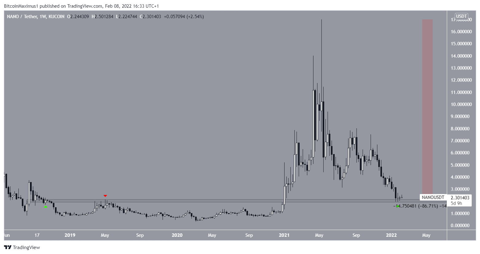 NANO has been falling since reaching an all-time high price of $17 on May 13. The downward movement has led to a low of $1.91 on Jan 24 (green icon).Â