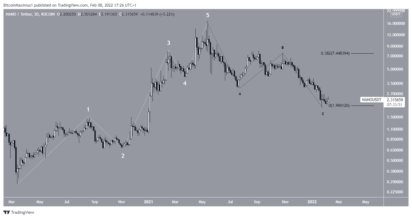 Nevertheless, the extremely short length of wave C makes it possible that the correction is not yet complete. This also fits with the price action, since NANO has yet to break out from its second descending resistance line or the $4 resistance area.Â