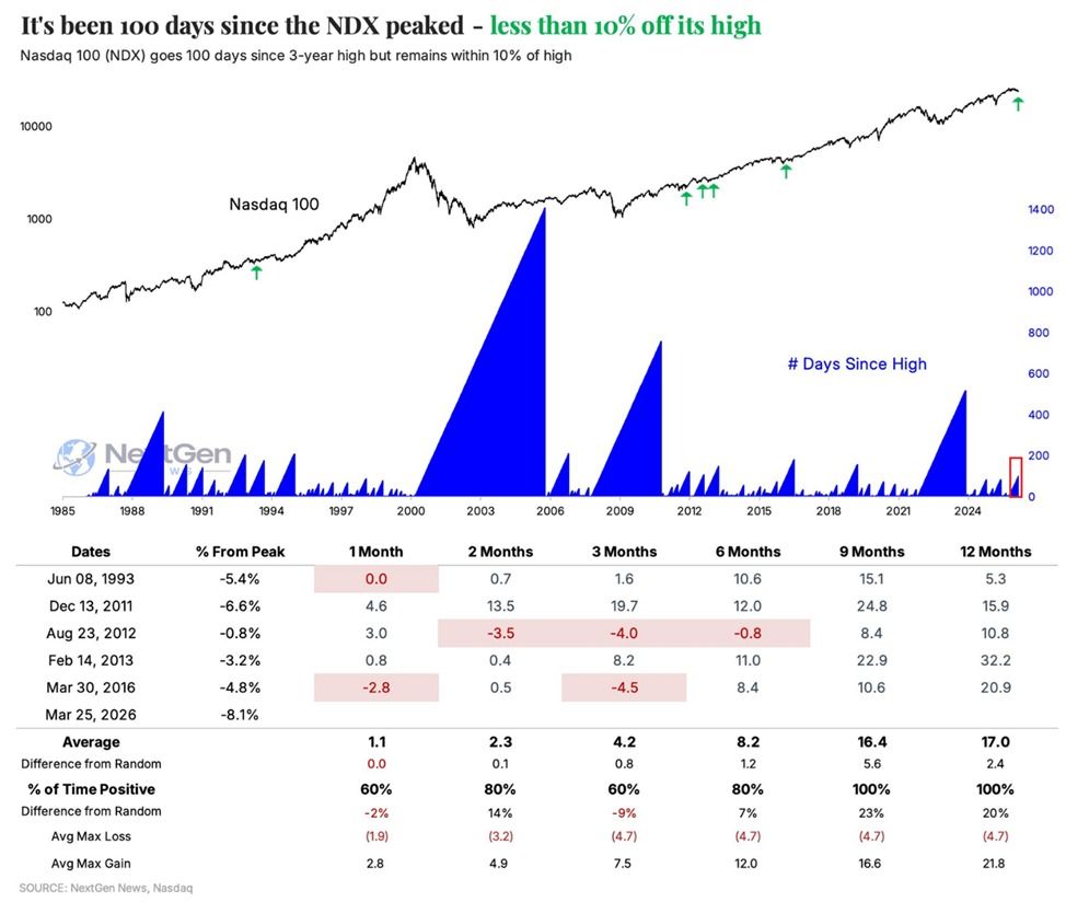 The Kobeissi Letter highlighted that the index has spent 100 consecutive trading days below its all-time high, the longest such streak since 2023.