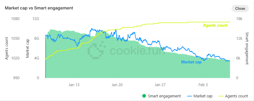 Despite these bullish predictions, the AI agent market has faced recent headwinds despite a surge in project counts. Data indicates that AI agent-related cryptocurrencies have struggled, with their market cap experiencing a notable decline. Similarly, smart engagement, which determines whether a project is short-term hype or can sustain interest, is declining.