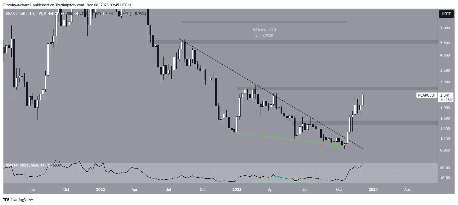 The weekly time frame technical analysis shows that the NEAR price had increased since October, when it broke out from a long-term descending resistance trend line. Before the breakout, the trend line had been in place for 440 days.