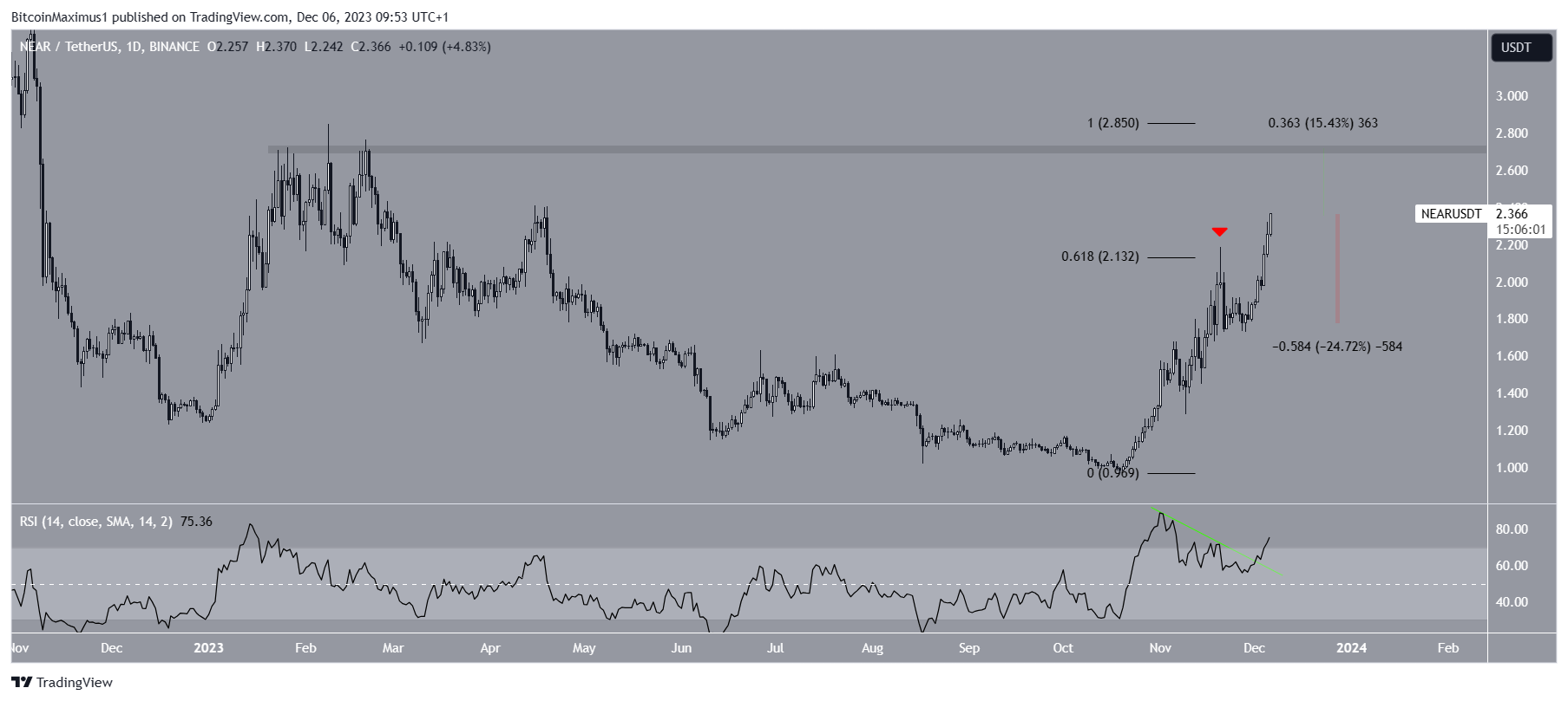 Despite this bullish NEAR price prediction, a decrease below the 0.618 Fib level at $2.13 will mean the upward movement is complete. A 25% retracement to $1.80 will then be expected.
