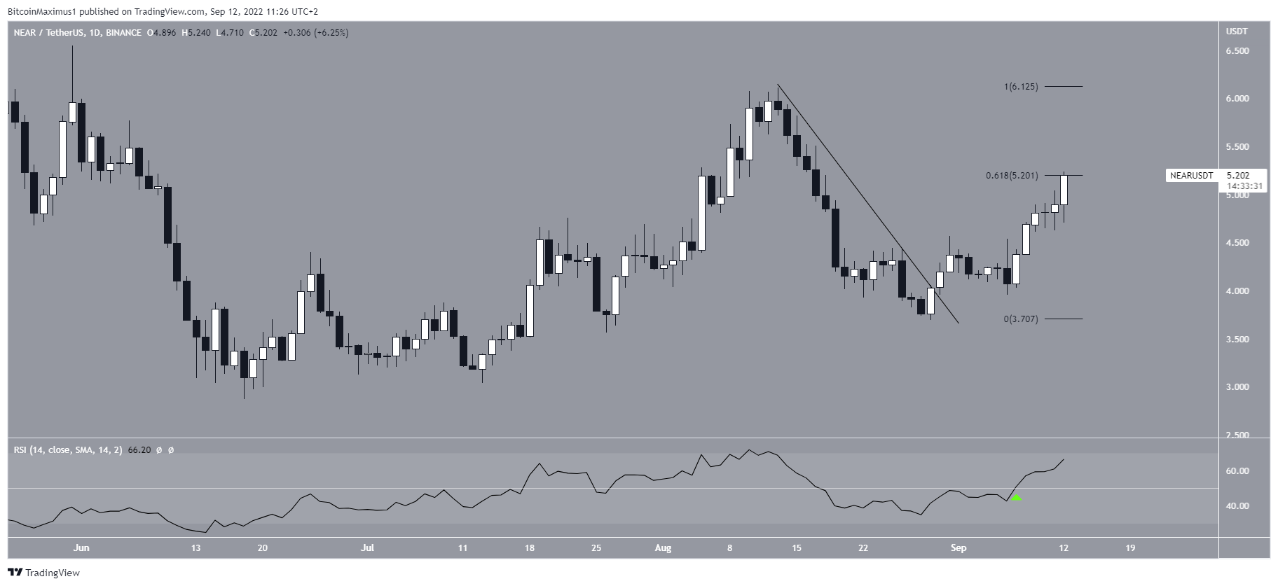 The daily chart shows that NEAR has broken out from a descending resistance line which was previously in place since Aug 13. Afterward, it initiated an upward movement that accelerated on Sept 7.Â