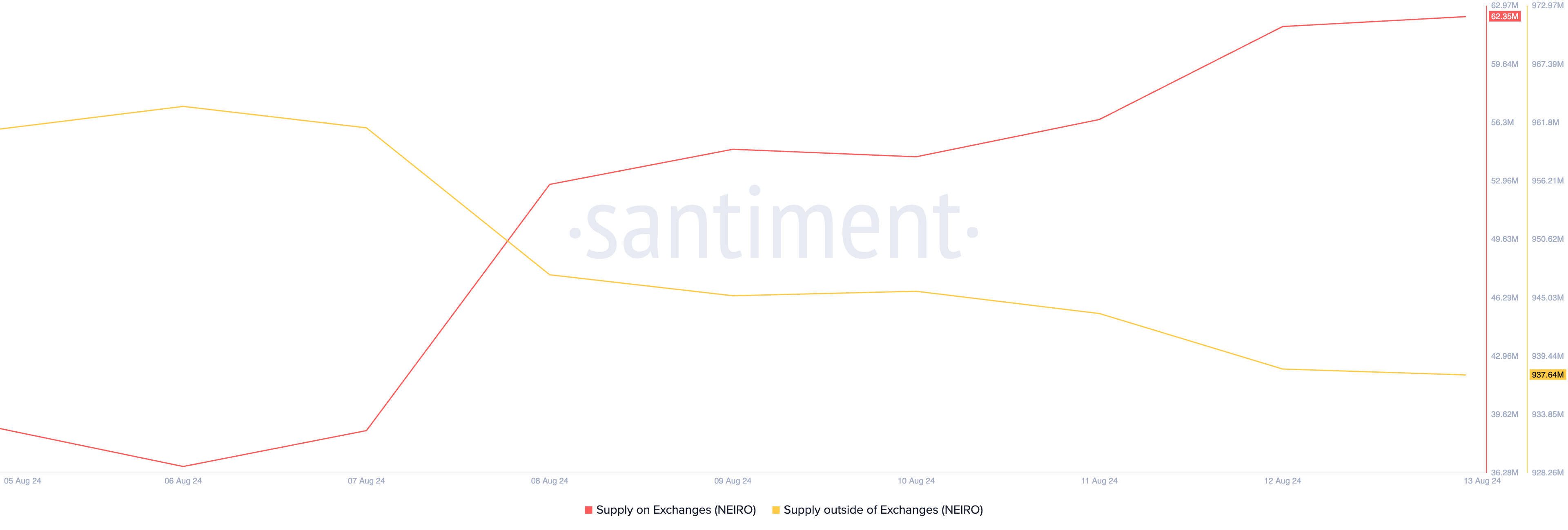 Currently, 62.4 million NEIRO tokens, valued at $15 million based on current market prices, are held on exchanges. Converesly, during the same period, the amount of NEIRO held outside of exchanges has declined by 2%.
