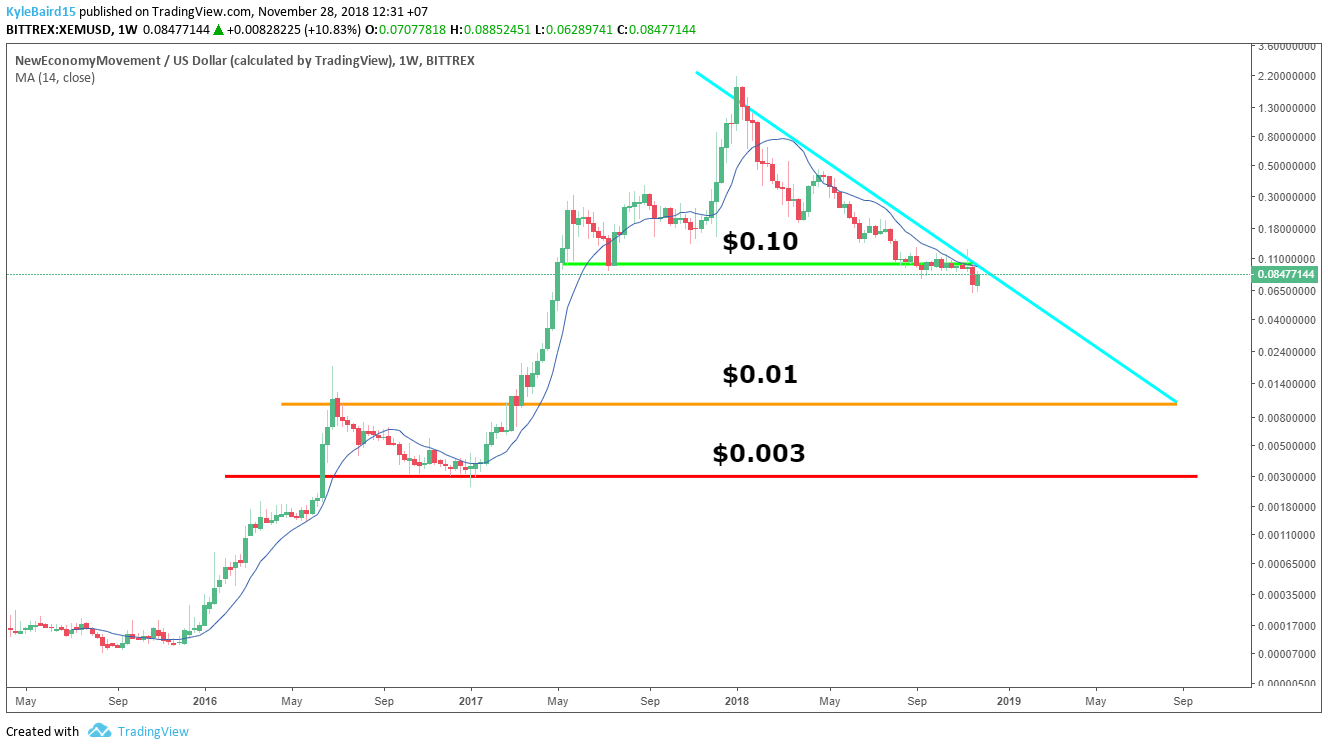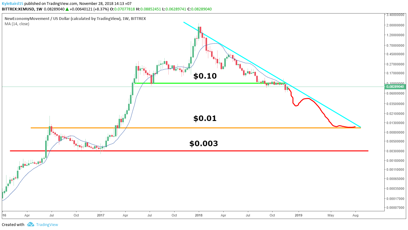 Since Bitcoin’s most recent decline, however, we have seen NEM continue to sink below the support — unable to escape the massive descending trend line.