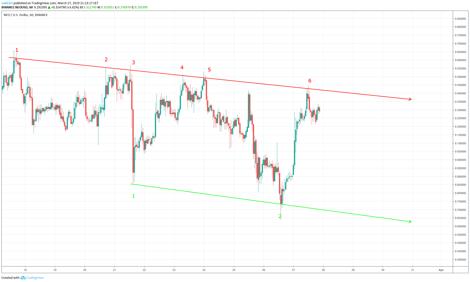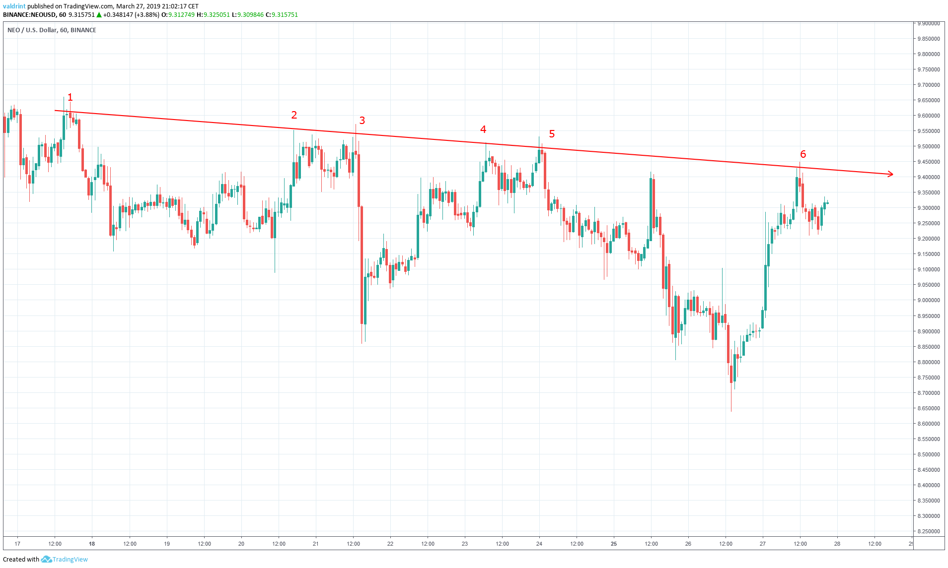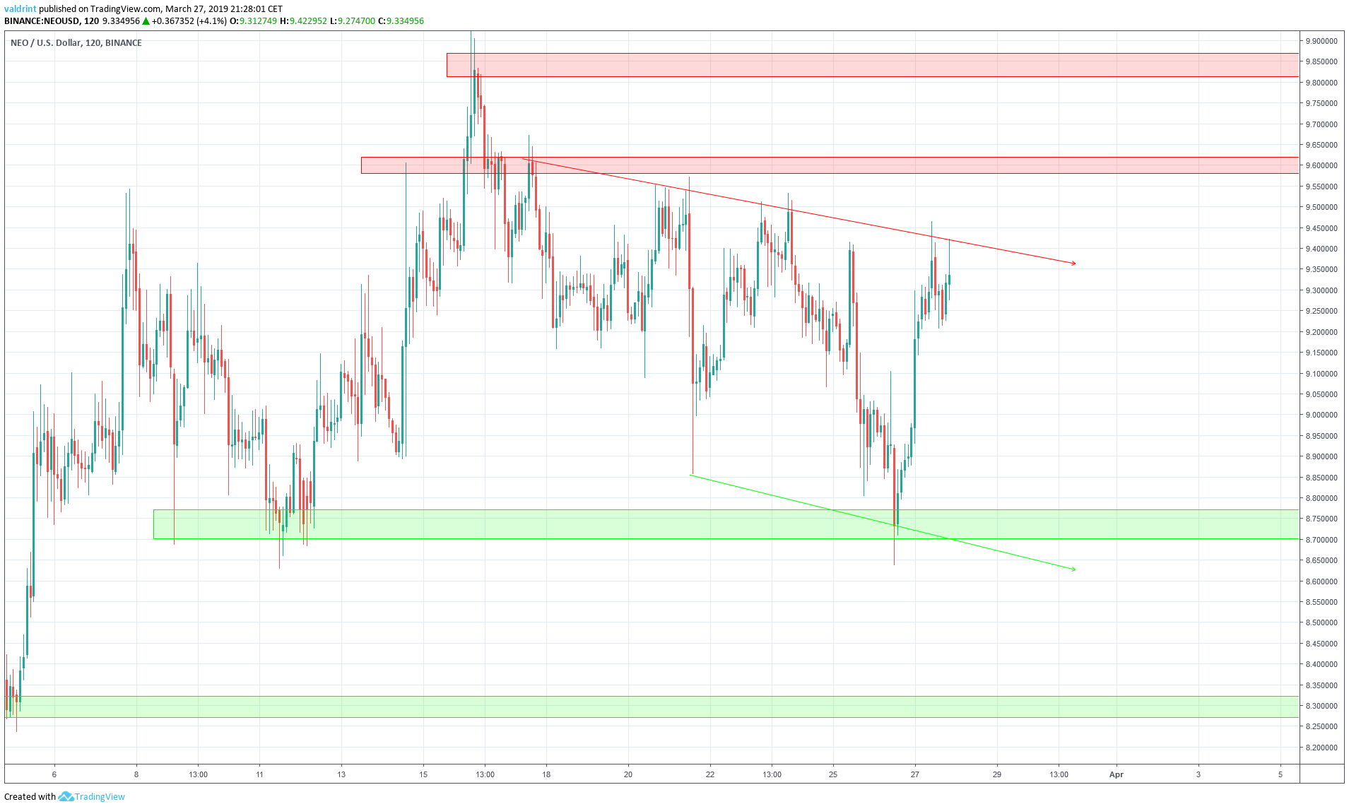 The price of NEO on Binance is analyzed at two-hour intervals from Mar 9 to Mar 27 in order to better visualize potential reversal areas in the future.