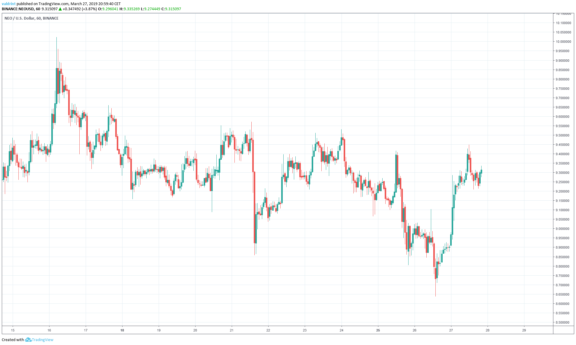 On Mar 16, 2019, the price of NEO (NEO) reached a high of $10. It has been on a downtrend since, alternating between gradual and sharp decreases. It reached a low of $8.63 on Mar 26.