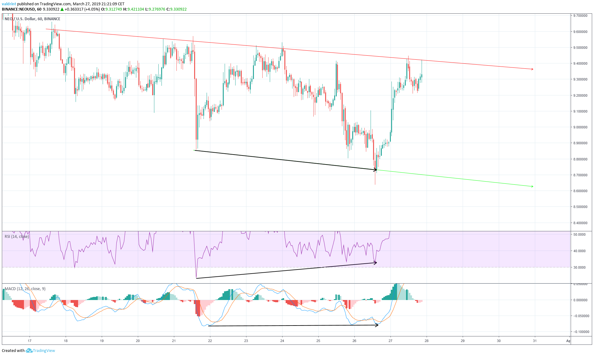 This is known as bullish divergence and often precedes price increases. In the case of NEO, an upward move was initiated shortly after the development of the divergence.