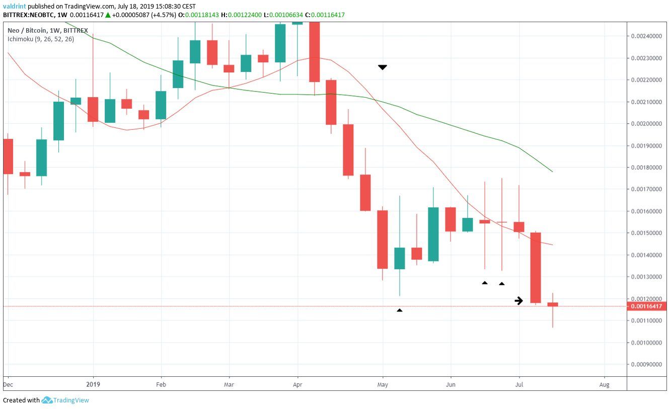 However, it was all erased by the engulfing bearish candle in the week of July 8-15. During it, the NEO price closed below 120,000 satoshis — confirming the existence of a downtrend.