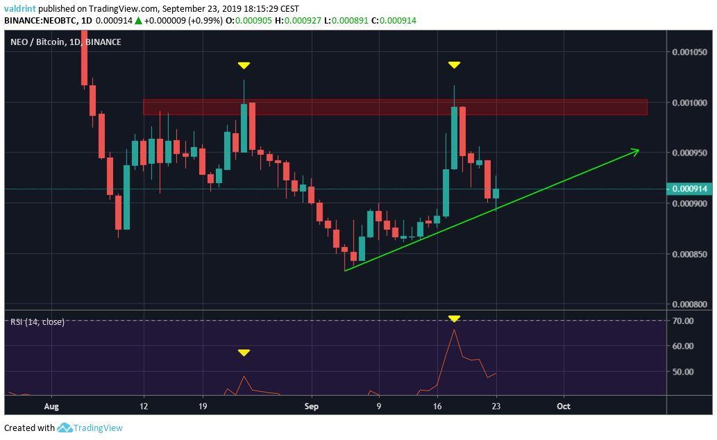 On September 17, 2019, the NEO price reached a low of 88,500 satoshis. It immediately began an upward move, reaching a high slightly above 100,000 satoshis on September 19. It has been decreasing since.