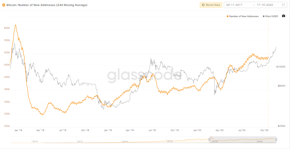 According to Glassnode’s data, the 24-day moving average of new Bitcoin addresses created has risen from just over 350,000 in April 2020 to just under 550,000 as of Nov 18.