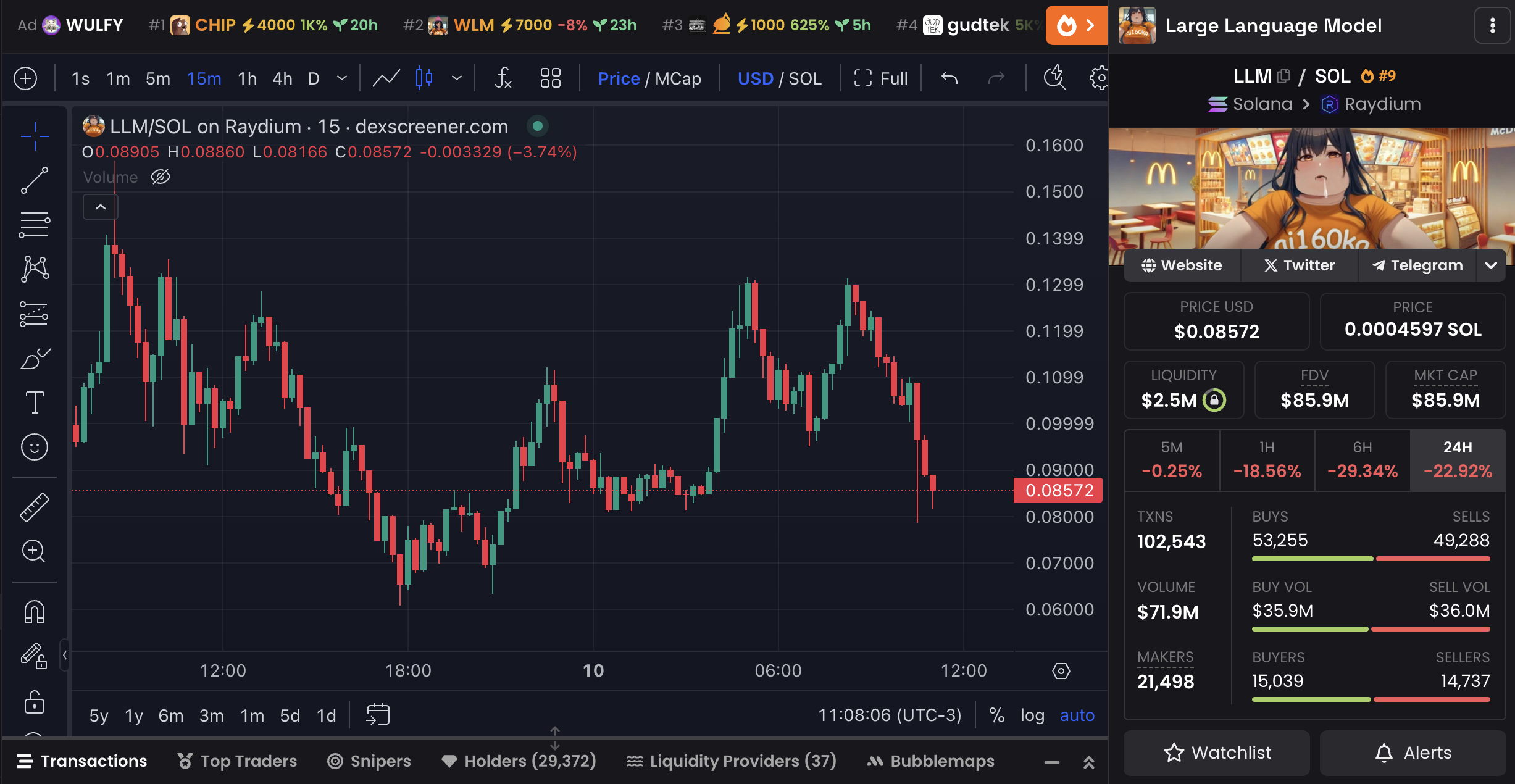 Currently, LLM boasts a market cap of $86 million, down from over $107 million one day ago. Despite this decline, the coin is maintaining strong activity, with more than 100,000 daily transactions and a trading volume of $71 million in the past 24 hours.