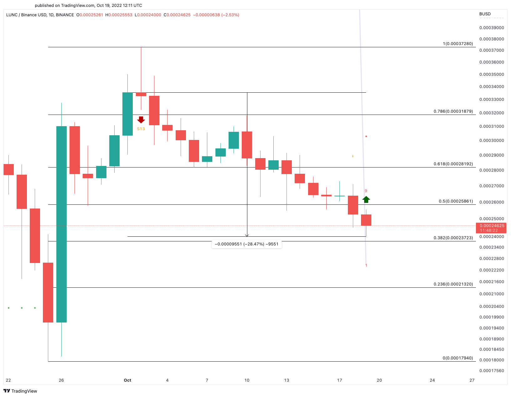 LUNC price struggles, retracing nearly 29% since Oct. 1. The Tom DeMark (TD) Sequential indicator presented a buy signal on Terra LUNA Classic price daily chart. The bullish formation suggests that if LUNC price can hold above $0.00024, it could rebound to $0.00026 or even $0.00028.