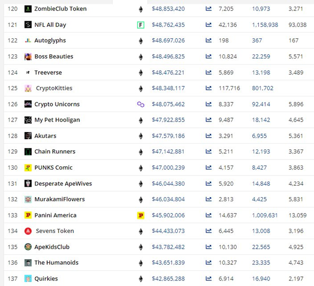 Sales from NFL ALL DAY were first tracked in February 2022 and have already surpassed CryptoKitties, Crypto Unicorns, Chain Runners, Panini America, and Ape Kids Club.