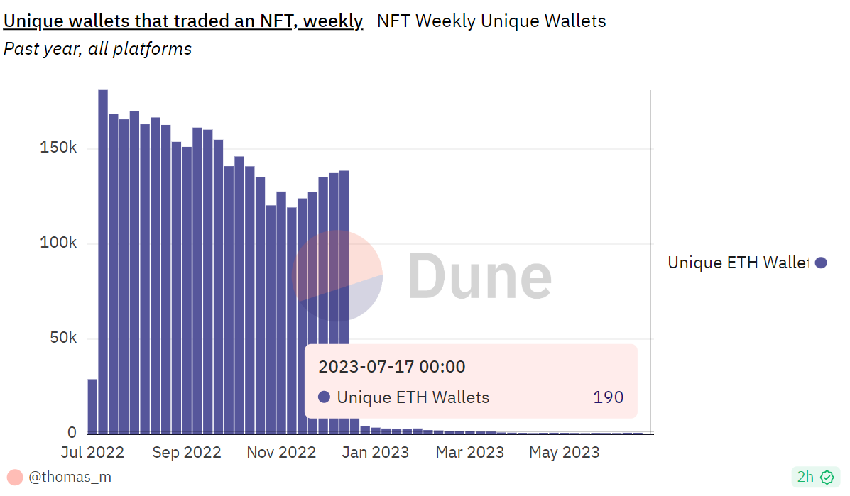 In the past seven days, only 190 unique ETH wallets have bought or sold an NFT, according to data from Dune. Compare that to almost a year ago when over 181,000 unique ETH wallets did the same thing.