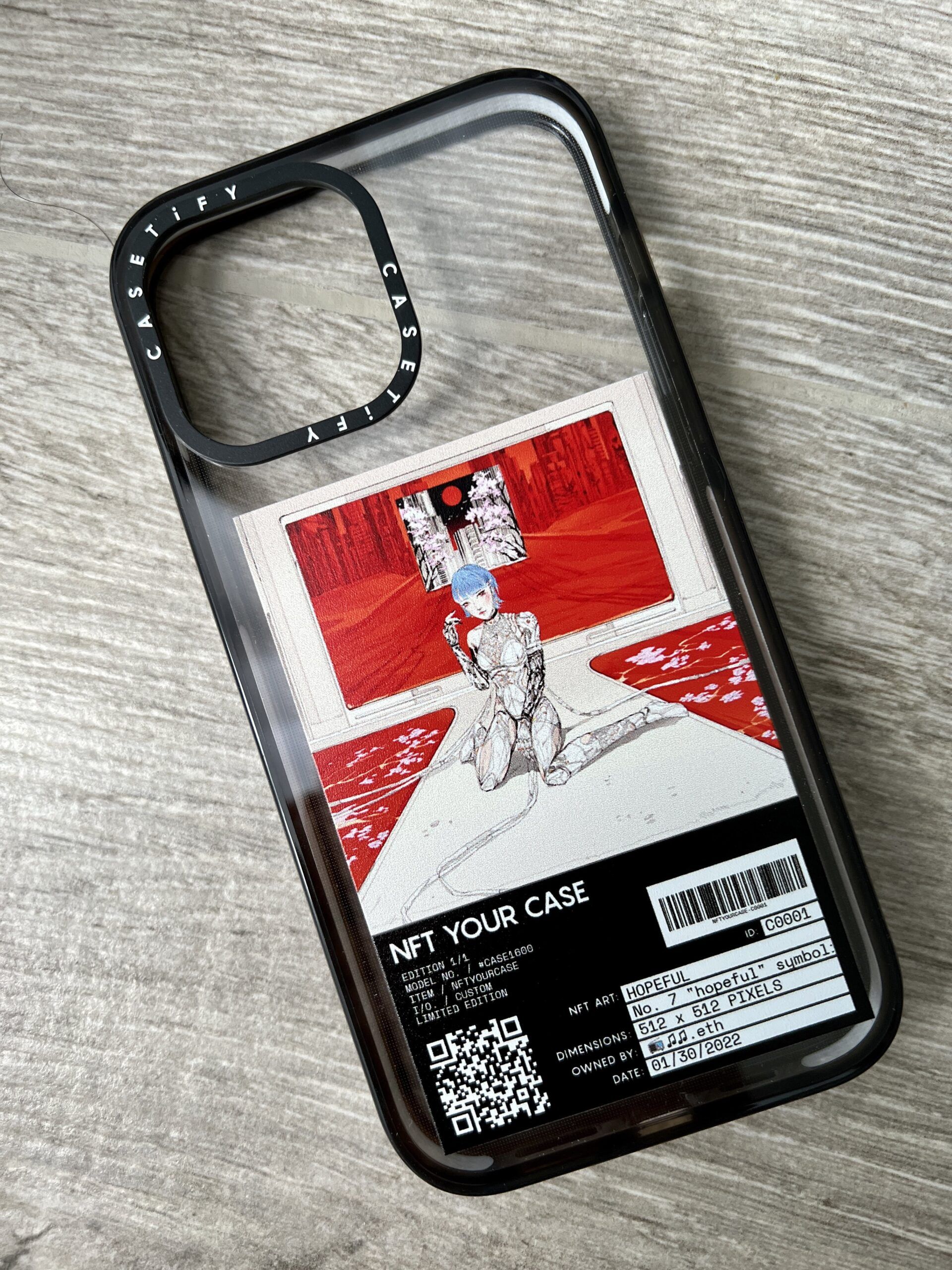 Each phone case comes printed with an exclusive NFT QR code. This traces the phygital product’s origin. And it includes metadata on the artwork, artist, and listing.