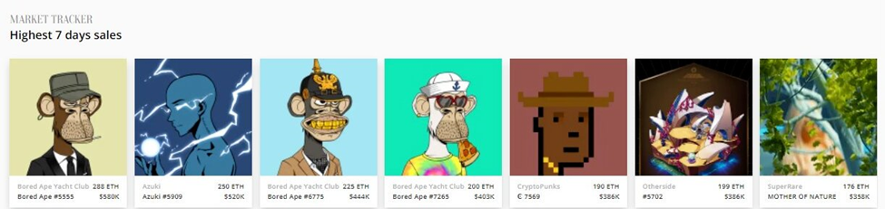 Overall, the highest 7-day sales totaled $3 million, and four (BAYC, CryptoPunks, Otherdeed, and Azuki) of the five projects make up the top 10 NFTs by all-time sales volume.