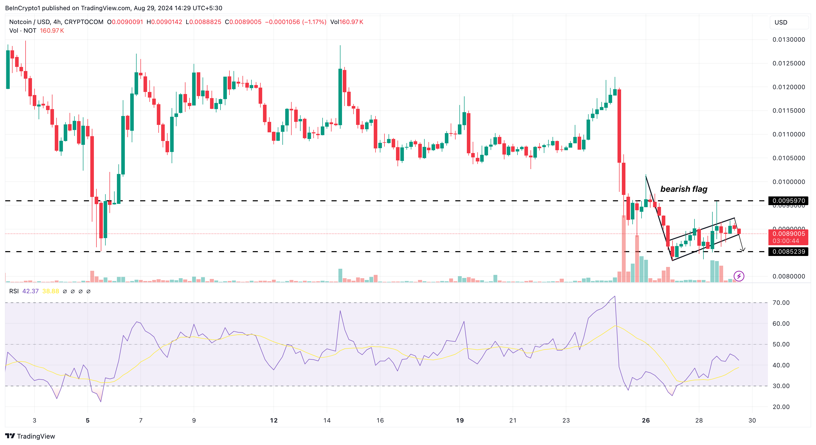 The low RSI reading suggests a lack of bullish momentum, which could push the price lower. However, if buying pressure increases, NOT might climb toward $0.0095, potentially invalidating the bearish outlook.