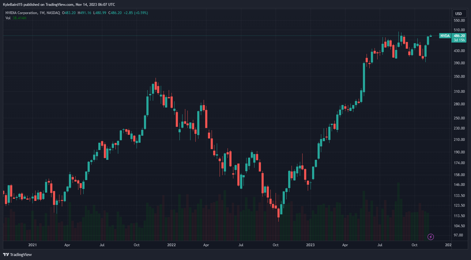 Nvidia stock (NVDA) returned to the $486 price level on November 13, approximately $12 short of its $502 all-time high. Overall, this marks a nearly 250% increase from the start of 2023.