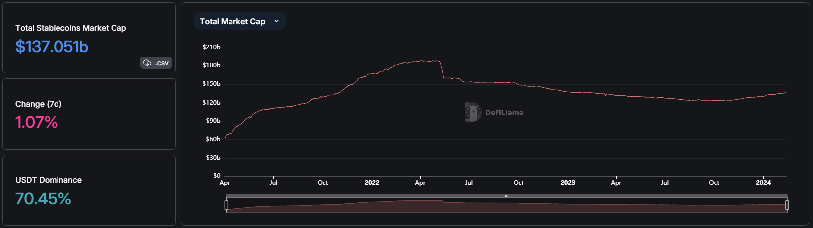 SponsoredDespite these fears, the total stablecoin market cap is currently at a 1-year high above $137 billion.