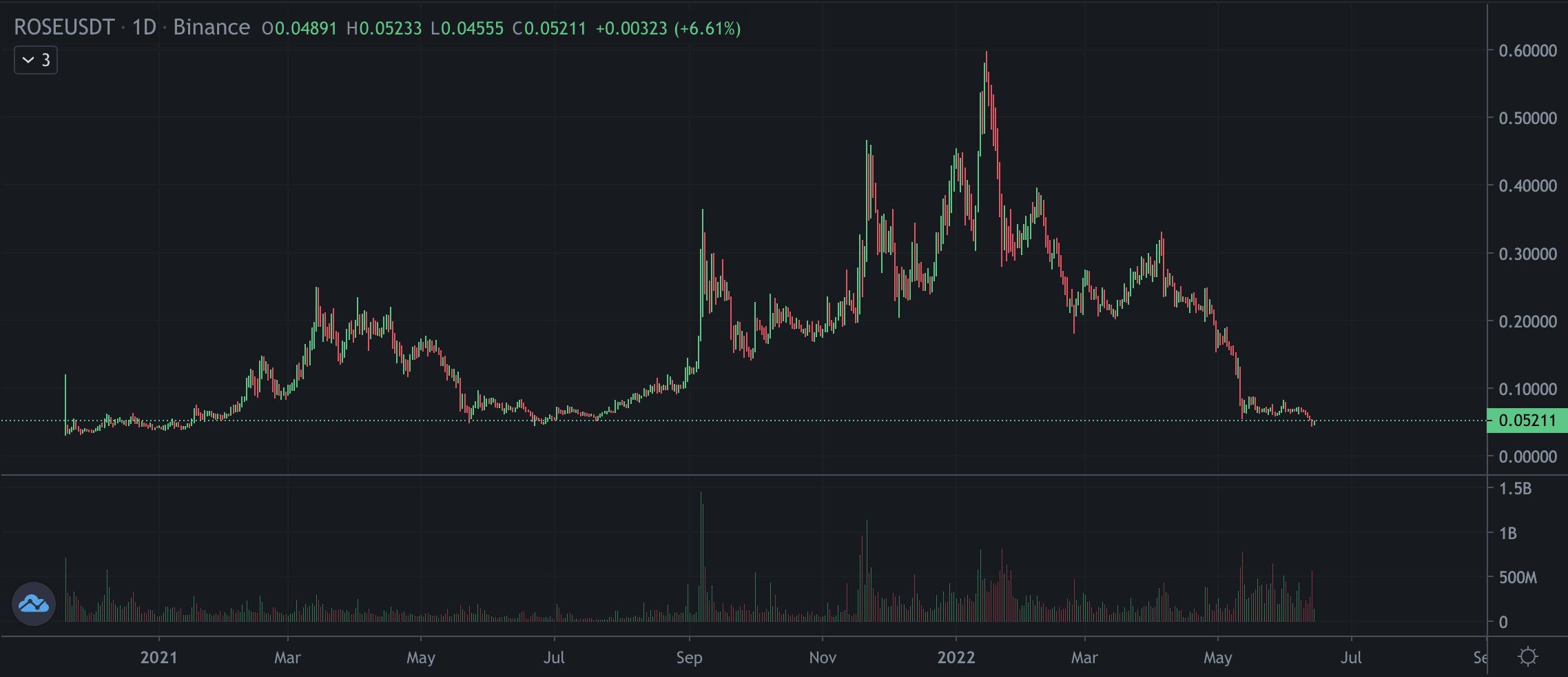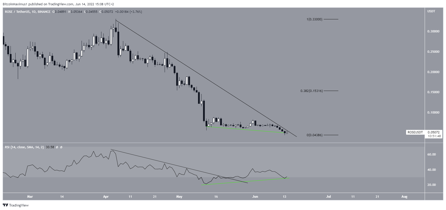 ROSE has been falling since reaching an all-time high price of $0.598 on Jan. 10, 2022. The downward movement led to a low of $0.043 on June 13. Measuring from the all-time high, this amounted to a drop of 91.75%.Â