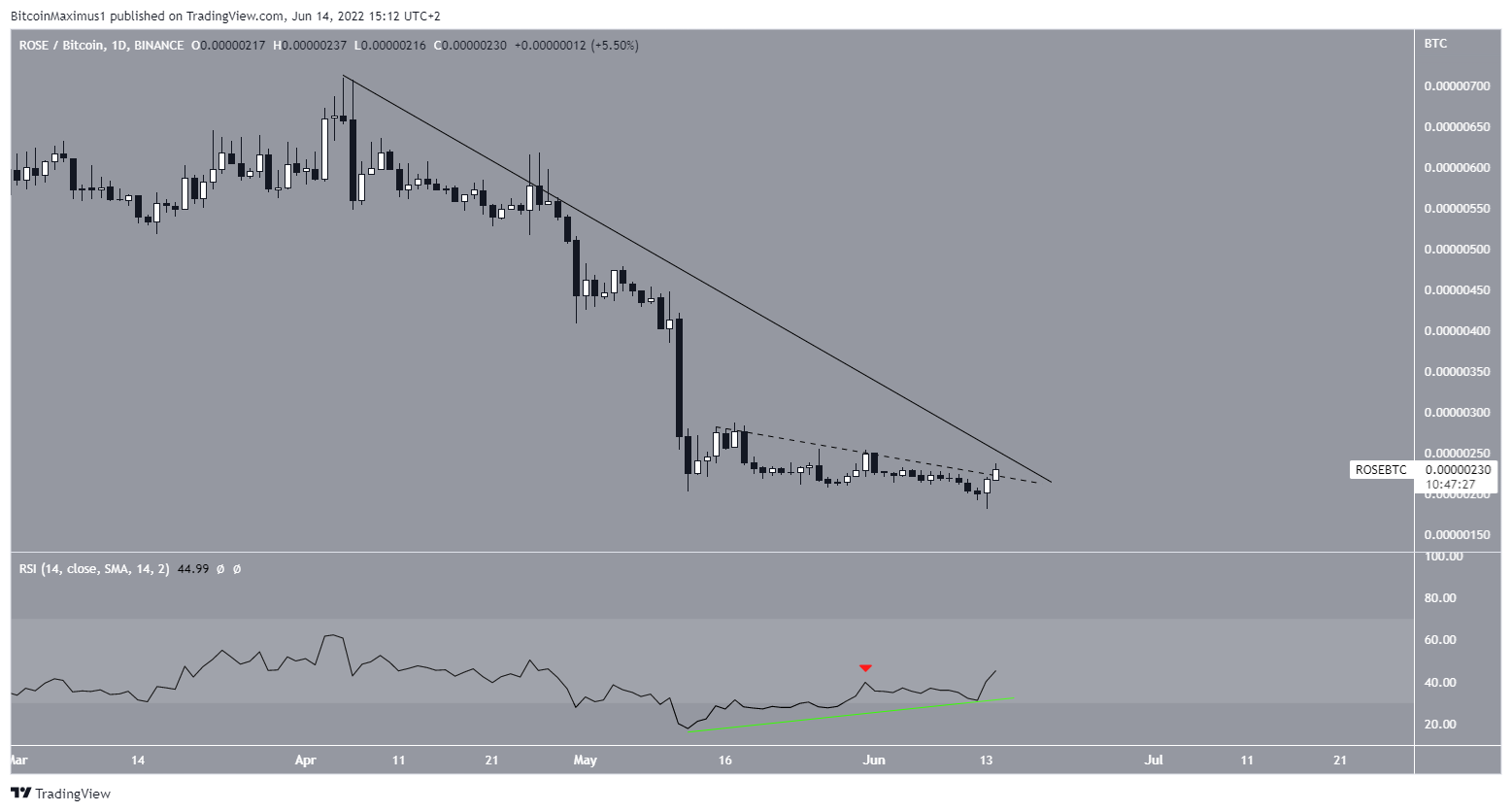 Similar to the ROSE/USD pair, the ROSE/BTC pair is following a descending resistance line. However, the latter can be considered bullish since it has already broken out from a shorter-term descending resistance line (dashed).Â