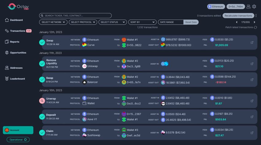 Octav’s DeFi labelling and tax reconciliation platform includes a DeFi labelling database, portfolio dashboard, and data analytics such as cost basis, profit and loss, and fees paid. It also allows anyone using the platform to contribute to the DeFi machine learning algorithm dubbed “The Brain” by labeling any unknown transactions that are not yet part of the database.