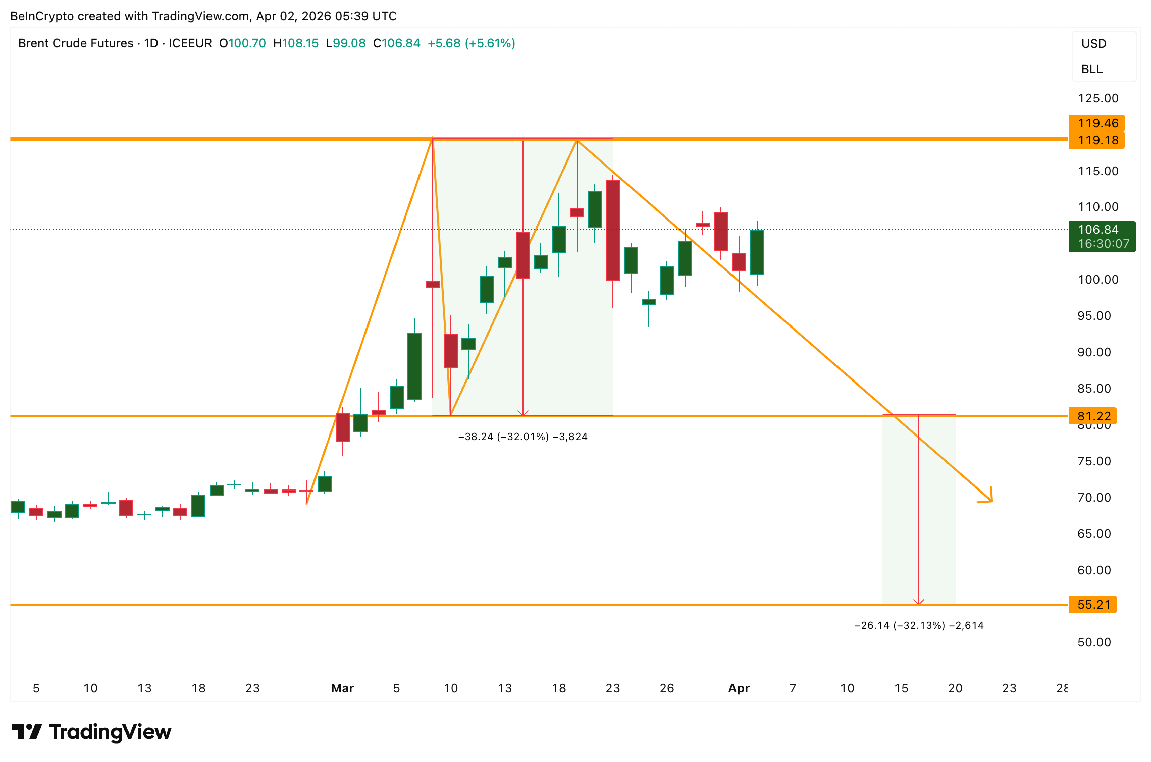 The neckline of the double top sits at $81. Between the two tops, the oil price corrected 32.01% before recovering, which validates the depth of the pattern. If the neckline breaks with a daily close below $81, the measured move projects a decline of approximately 32% to $55.