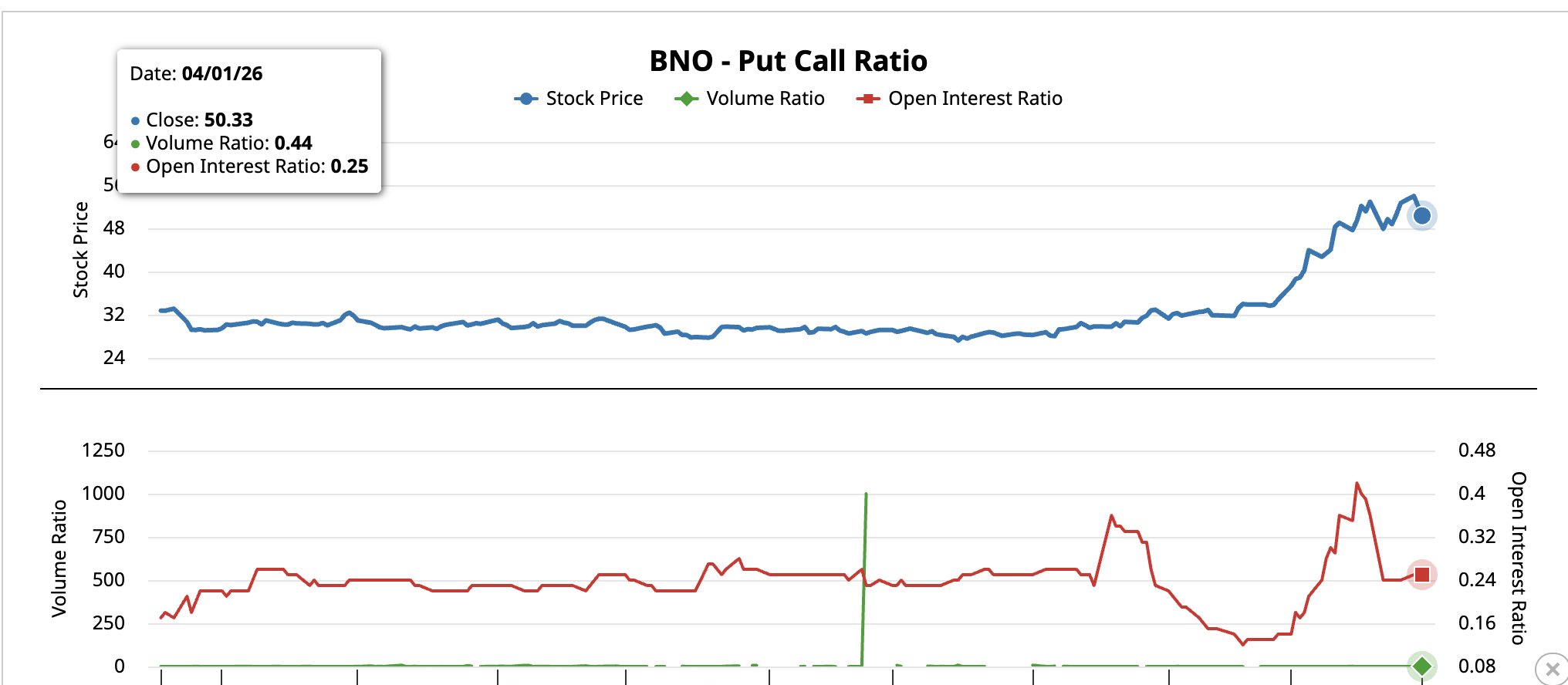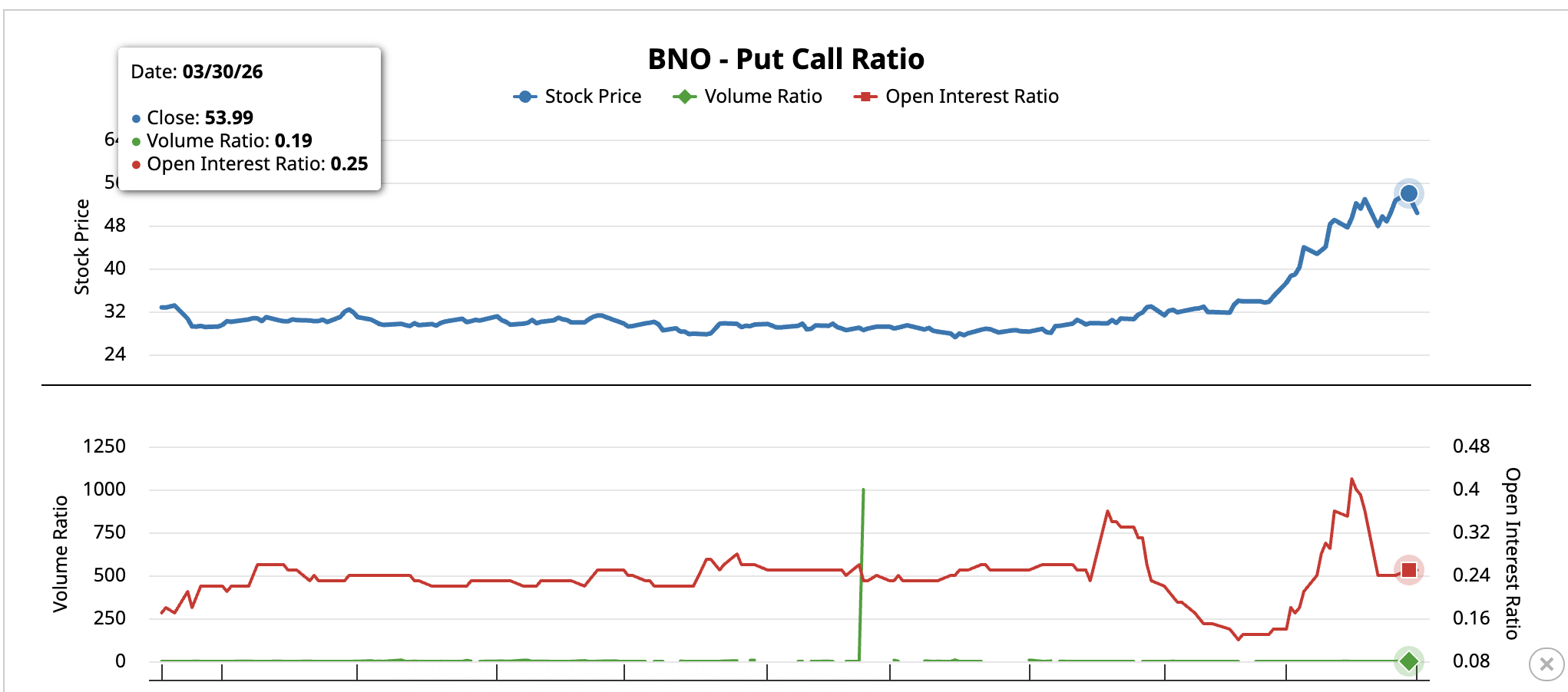 The second condition involves market positioning. The BNO Brent Oil ETF, the primary US-listed vehicle for Brent crude exposure, shows a sharp shift in how traders are hedging.