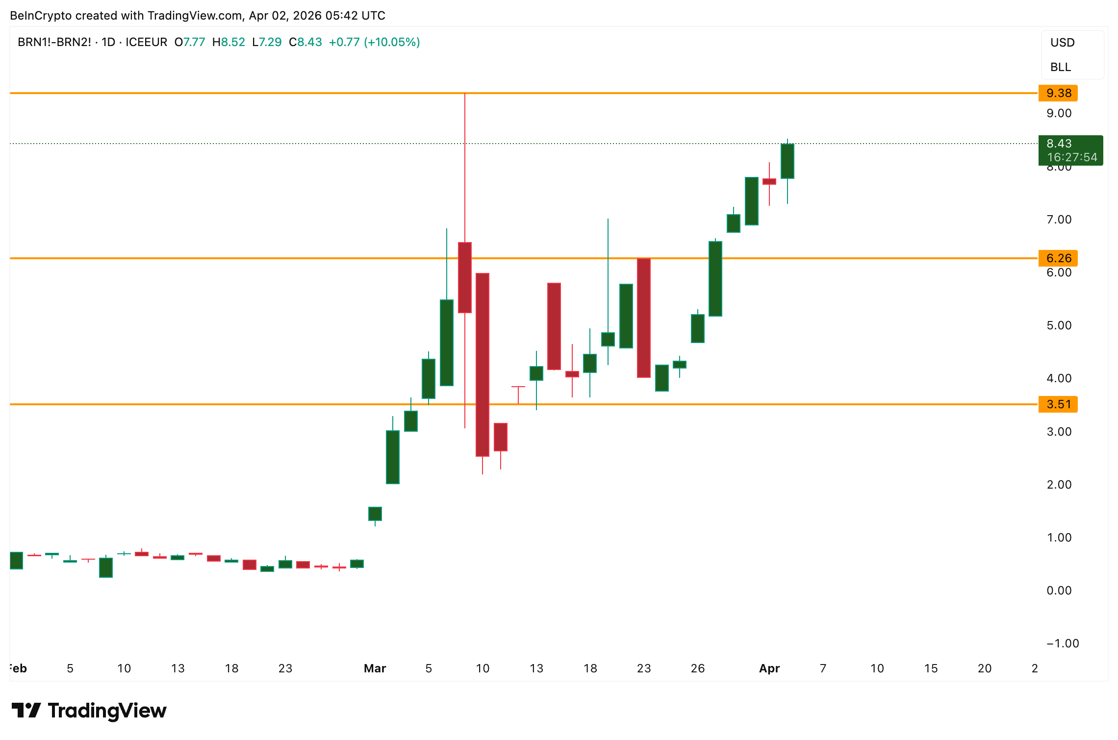 The crude oil futures curve tells a conflicting story. The spread between the front-month and second-month Brent contracts, a measure of near-term supply urgency known as backwardation when positive, surged to $8.43 on April 2. Backwardation this steep means buyers of physical oil are paying a significant premium for immediate delivery because supply cannot meet current demand.