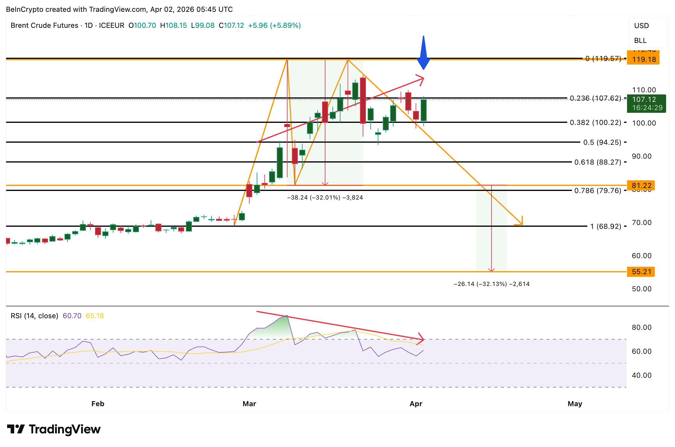 The Relative Strength Index (RSI), a momentum indicator, however, strengthens the case for exhaustion. Between March 3 and April 2, the oil price is forming a higher high while RSI is working on a lower high. That bearish divergence indicates the rally is losing internal momentum even as prices push higher. Each new high is being driven by thinner conviction than the one before.