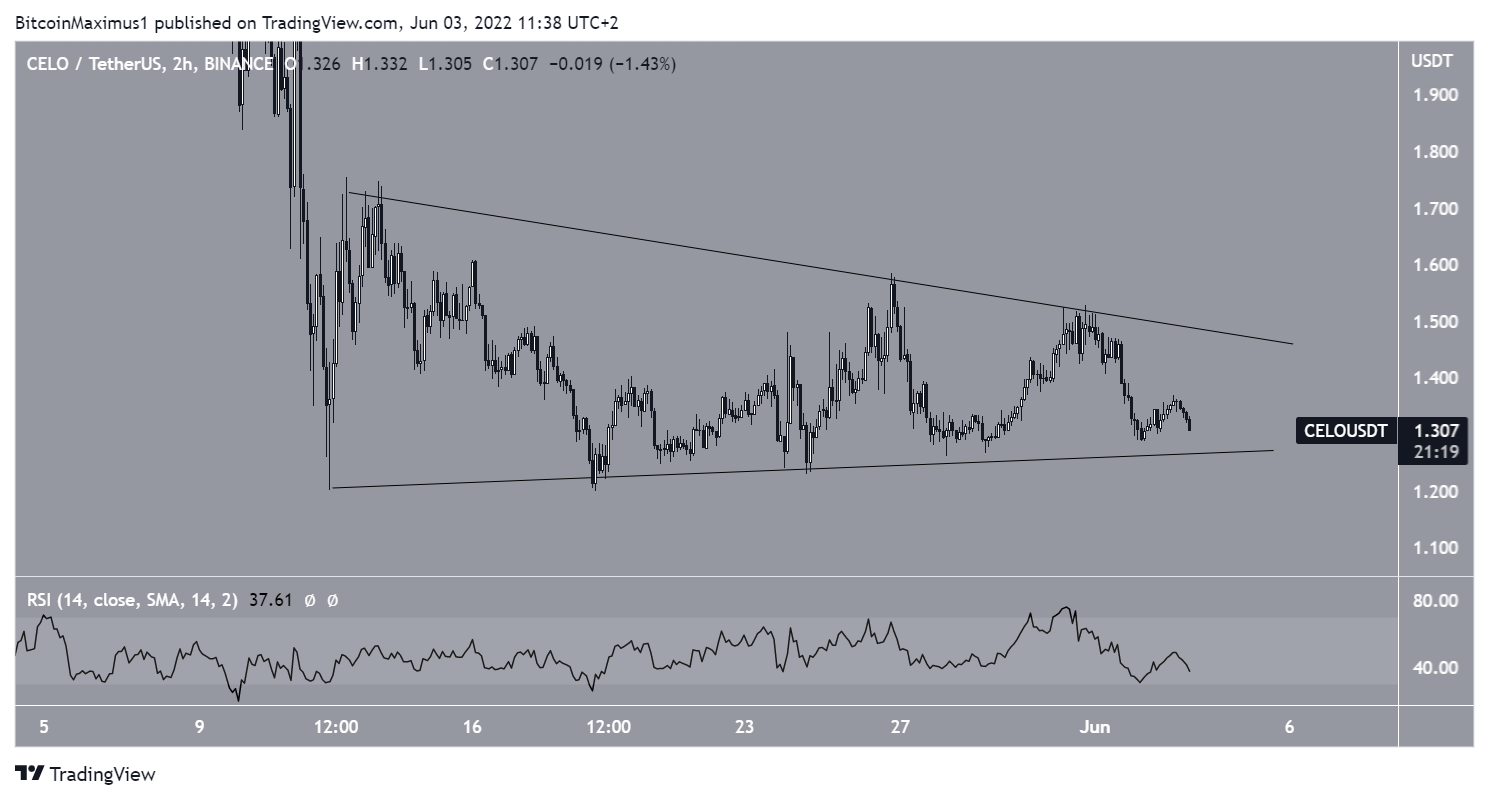 CELO has been trading inside a symmetrical triangle since May 12. While this is considered a neutral pattern, it is coming after a downward movement. As a result, a breakdown of it would be the most likely scenario.