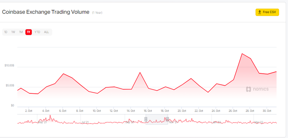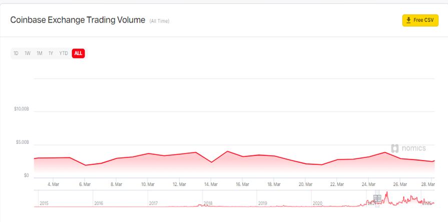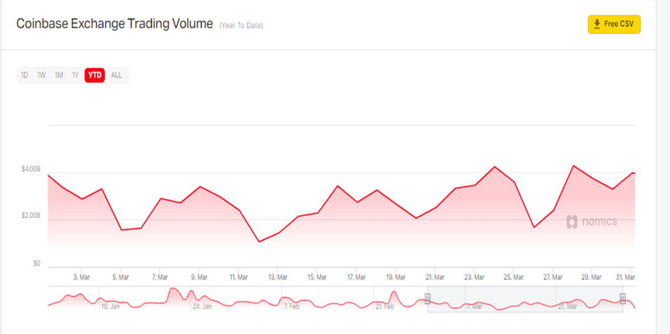 The total volume of Coinbase over the past year was down by 3% since March 2021, which saw around $92 billion in volume recorded, according to Nomics data.