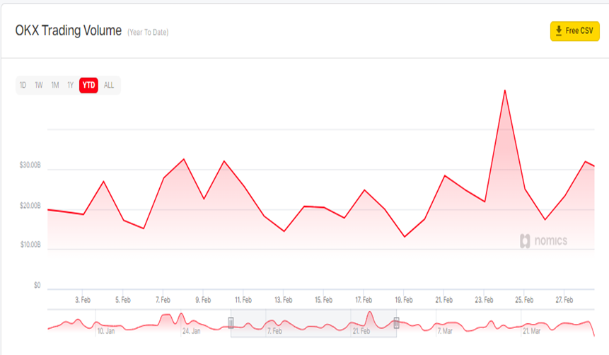 In contrast to Coinbase, OKX volume increased by 5% from February 2022. February 2022 saw OKX generate around $658 billion.