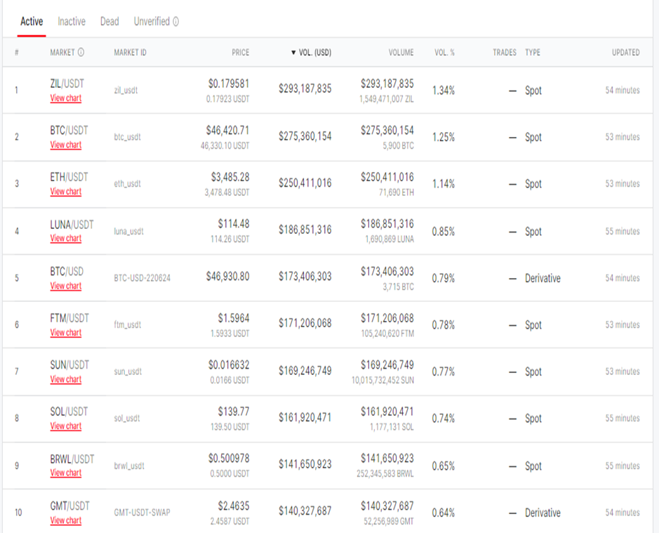 As of writing, OKX supports around 279 cryptocurrencies, approximately 28,964 markets, of which 796 are active. The top-10 markets on OKX are stablecoin-pairings of Zilliqa (ZIL), Bitcoin, Ethereum, Terra (LUNA), Fantom (FTM), Solana (SOL), Sun (SUN), STEPN (GMT), Blockchain Brawlers (BRWL), and United States dollar pairing of Bitcoin. The total volume of these markets is around $1.96 billion.