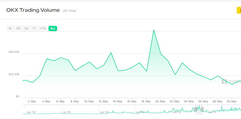 By the end of May 31, 2021, OKX had a total trading volume of approximately $828 billion. The difference between this all-time high and February’s statistic is $170 billion, a 20% decrease.