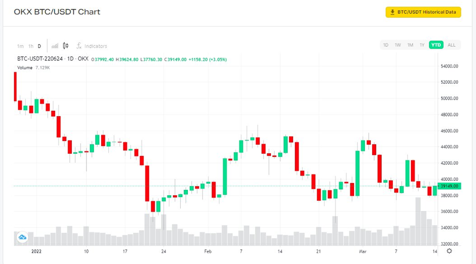 SponsoredIn February, BTC/USDT opened on Feb. 1, 2022, with a trading price of $39,895 and closed on Feb. 28 at $39,555.