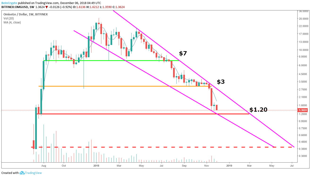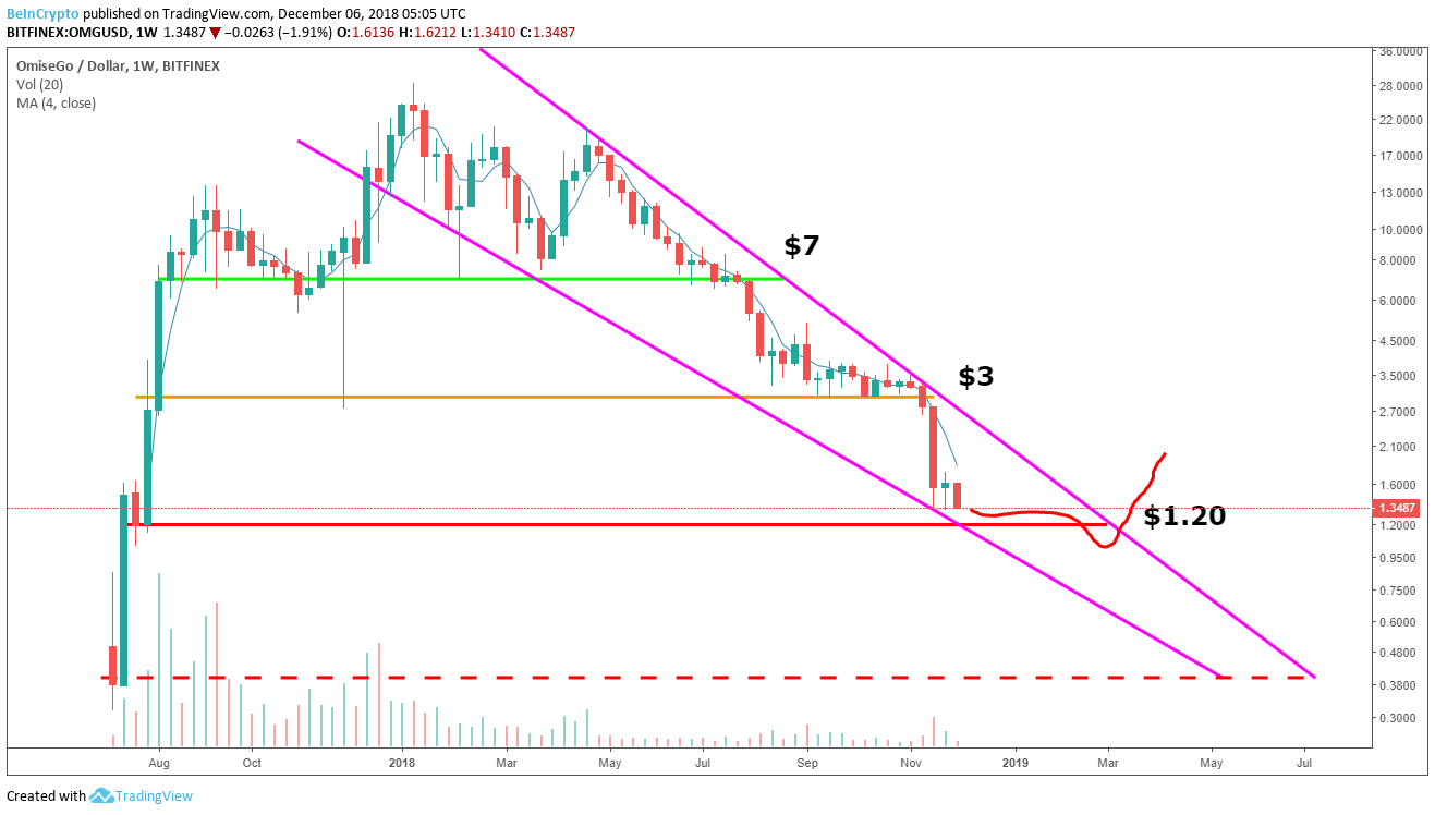 OMG is hovering slightly above its 2018 low at the time of writing, and will most likely spend the remainder of 2018 establishing a new support level in the neighborhood between $1.20 and the psychological support at $1.