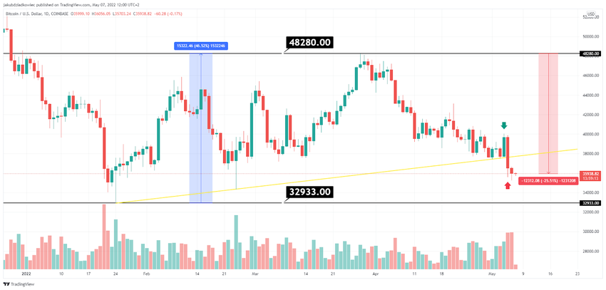 Since the one-year peak, there has been a multi-week decline that has brought the BTC price to its current level near $36,000, or -25.5%. It is worth mentioning that Bitcoin has not closed a daily candle below the important support level at $35,000 in 2022.