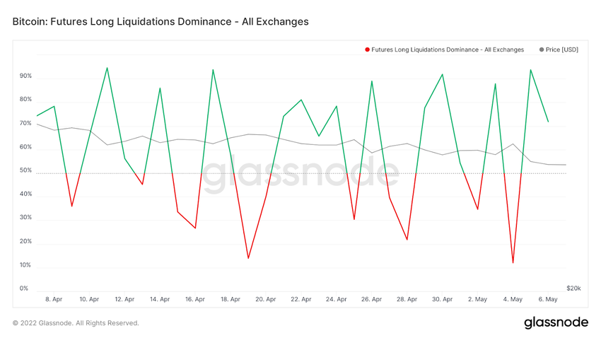 This indicator measures the percentage of long liquidations, i.e. long liquidations / (long liquidations + short liquidations). A level of 50% means that the same number of long and short liquidations took place. Values above 50% mean more long positions were liquidated, and values below 50% mean more short positions were liquidated.