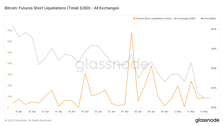 According to data from CoinGlass, on that day short liquidations were recorded at the level of $45.5 million. On the other hand, according to Glassnode, short liquidations amounted to $25 million. It is worth mentioning that traders betting on declines last suffered bigger losses on April 25, when BTC broke out above $40,000.