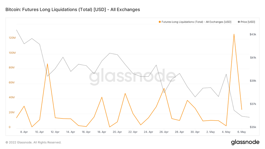Also high, albeit slightly lower than the one above, readings are provided by a chart from Glassnode. According to this on-chain data provider, the total long liquidations of Bitcoin futures contracts were nearly $127 million on the day of the decline. The difference in these values is probably due to the different range of exchanges that the two analyst firms take into account.